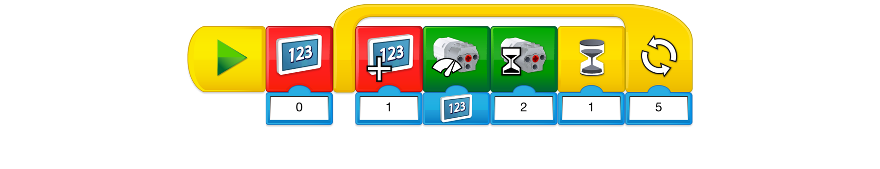 This program will start by displaying no. 0 on the screen. It will then repeat a series of actions five times. It will add no. 1 to the display, which will become the shaking magnitude, turn the motor on to that magnitude for 2 sec., and then wait for 1 sec.